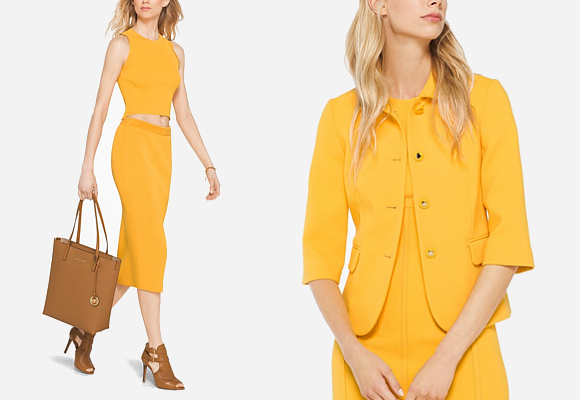 Si por el contrario te vuelves loca con el color y quieres llamar la atención con un ‘look total yellow’, la propuesta de Michael Kors es perfecta. Conseguirás un resultado siempre sofisticado y atemporal con esta falda lápiz acanalada de viscosa elástica o con una chaqueta de crepé rizado elástico con cuello italiano, delantera abotonada y bolsillos con parche. Ideal.