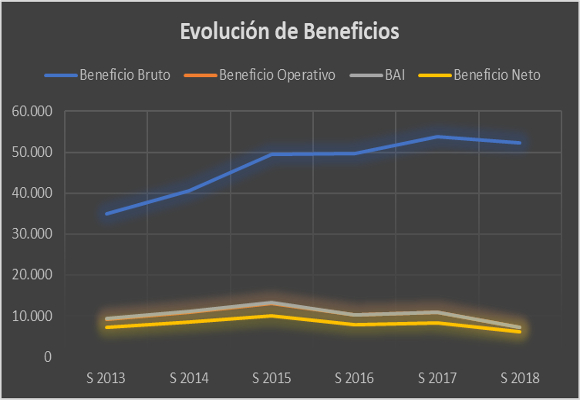 La explosión en el crecimiento de los gastos administrativos (+11,15%) y un mayor crecimiento del resto de los costes operativos hacen que el beneficio operativo caiga un -33,25 % y que el margen operativo disminuya -364 p.b. para situarse en el 7,35%. Hay que tener en cuenta que los costes operativos representan el 45,83% del total de ingresos, el nivel más alto de los cinco últimos años.