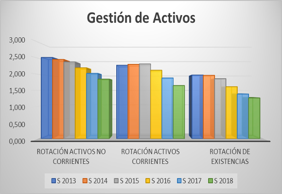 Los ratios de solvencia a corto plazo mantienen su dirección hasta el óptimo valor. Si bien el ratio de tesorería da ligeras señales de deterioro. En cuanto a los ratios de gestión de activos, como podemos ver en el siguiente gráfico, nos dan muestras un preocupante empeoramiento en la utilización de los activos no corrientes, corrientes y de existencias. Con crecimientos de ventas nulos, las estructuras actuales de los activos de la compañía están muy infrautilizados.