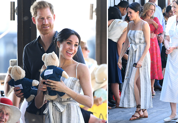 En las últimas horas hemos podido ver a Meghan Markle paseando brevemente con su marido por la Bahía de Kingfisher. La Duquesa de Sussex, que se ha refugiado en unas amplias gafas de sol para no evidenciar el cansancio, ha lucido un vestido gris y blanco con rayas verticales de Reformation y unas sandalias marrones con tira al tobillo de Sarah Flint.