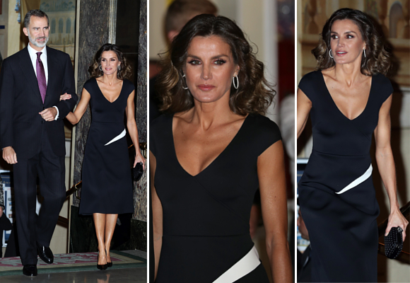 Letizia optó por este vestido en negro, de línea trapecio, con falda por debajo de la rodilla y con un detalle en blanco en la cadera. A diferencia de lo sucedido en sus apariciones públicas en los recientes Premios Princesa de Asturias, la Reina Letizia prescindió de joyas relevantes, más allá de unos pendientes en forma de aro.