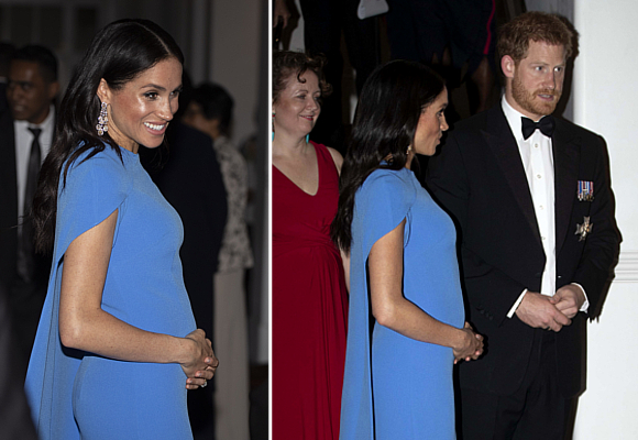 Su reciente gira por Oceanía nos demostró también que la gestación no entiende de agendas ni de eventos. El cansancio apareció y Meghan Markle tuvo que acotar sus apariciones públicas al tiempo que veíamos cambios evidentes en su fisonomía. En la gala del Grand Pacific Hotel de las Islas Fiji, Meghan Markle sorprendió a todos con un impresionante vestido azul de la firma británica Safiyaa que se ajustaba como un guante a su incipiente barriguita.