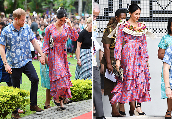 Porque presumir de embarazo es algo más que recomendable y la esposa del Príncipe Harry lo sabe perfectamente. Y en la enorme oferta disponible de estilos y looks, la ex-actriz se decanta también por el estampado de flores, como el diseño de llamativos pompones de Figue con el que descubrimos su lado más bohemio. Para esta ocasión, la duquesa completó su look con unas alpargatas españolas de Castañer.