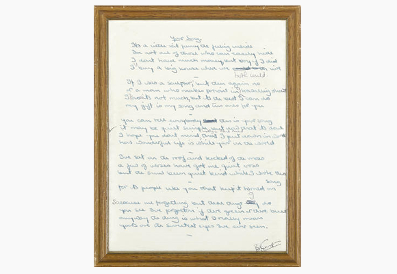 En la tarde de hoy, lunes 19 de noviembre, se subasta en Nueva York la letra manuscrita de "Your song", la canción que ha escogido Elton John para resumir su vida.
