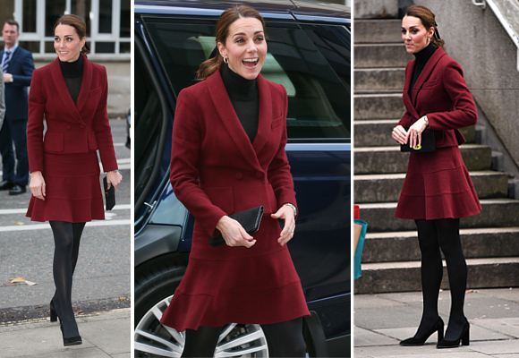 Kate Middleton acudió a la University College London con un traje de chaqueta que estrenó en 2012. Un look que también llevó el año pasado con botas, pero que prefirió combinar esta vez con unas medias negras y unos salones. La duquesa de Cambridge completó su atuendo con un jersey de cuello vuelto del mismo color.