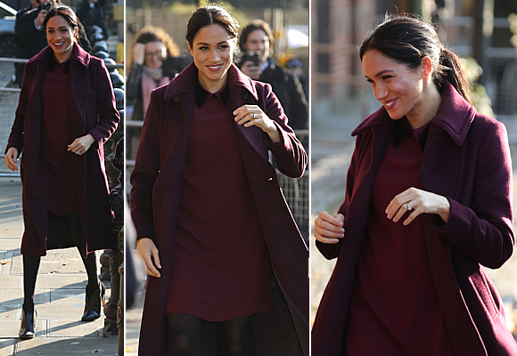Por su parte, la duquesa de Sussex acudió a un comedor social con un vestido en burdeos de la firma Club Monaco. Lo combinó con un abrigo del mismo tono, medias negras también y el toque especial en el calzado. Unos botines de Givenchy para pisar con fuerza.