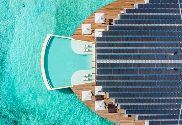 A la isla llegaron los Ferragnez como cualquier otra persona: por barco o hidroavión, dado que no hay otra forma. Desde lo alto se puede ver el edificio principal del complejo, con una cubierta a dos aguas plagada de los paneles fotovoltaicos que suministran la energía. Aunque lo usual es procurar esconder estos paneles (no son estéticos, es evidente) mediante un diseño ocultista, en el resort se han utilizado como elemento icónico, logrando lanzar un claro mensaje: quieren integrar el sistema solar en el diseño general del complejo.