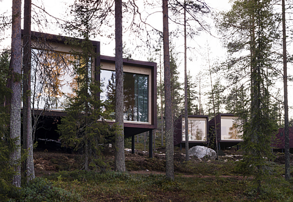 El Arctic TreeHouse Hotel se ubica en plena Laponia finlandesa, en el círculo polar ártico, lo cual nos viene muy bien para nuestro propósito. Además reúne las cualidades que estamos buscando: rodeado de espesa naturaleza, el hotel ofrece confort de lujo, manteniendo una extraña correlación entre las tradiciones locales de Laponia y el moderno diseño escandinavo. El diseño, de hecho, es tan simple como elegante. Los inmuebles tienen forma de paralelepípedos ortoedros de madera, eso sí, con una cara de cristal.