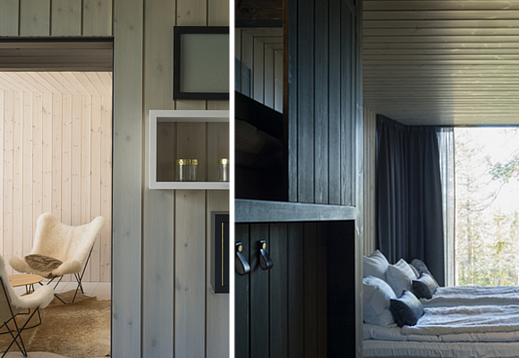 Para aumentar el contacto de los usuarios con la naturaleza, se decidió que el hotel no se ubicaría concentrado en un mismo espacio. De esta forma, el complejo se desarrolla en 32 edificaciones distintas, distribuidas a pares por la ladera natural. Las construcciones están inmersas en el corazón del bosque, orientadas hacia el norte, donde se ubica una pared de vidrio que ofrece las vistas más espectaculares que el lugar te puede dar, el bosque iluminado por los cielos árticos, una combinación perfecta.