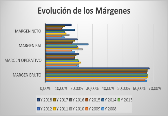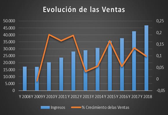Los ingresos por ventas se han incrementado respecto al año 2017 en un 9,83%, alcanzando los € 46.826 millones, cifra récord en la historia de esta compañía y muy por encima de mi horquilla de previsiones que se situaban en € 43.000-45.000 millones. Como podemos observar en el siguiente gráfico, las tasas de crecimiento mantienen una desaceleración que se va compensando en los dos últimos años, pero manteniéndose en los dos dígitos de crecimiento.