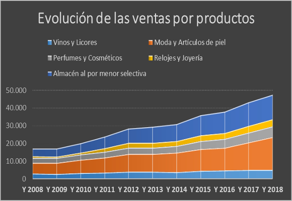 - Ventas al por menor selectivas (28,75%) ingresaron € 13.646 millones, lo que representa un crecimiento del 2,52%. El mal comportamiento de este sector es claro, ya que debemos recordar que los ingresos de 2017 se vieron afectados por la expiración de las concesiones del duty free en el aeropuerto de Hong Kong.