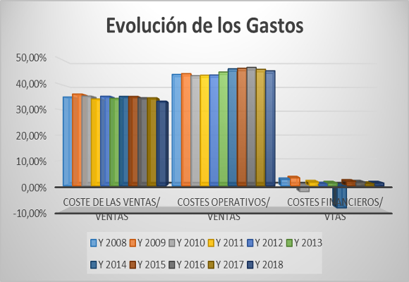 Si analizamos la cuenta de pérdidas y ganancias, al contrario que en años anteriores, la compañía ha mantenido una política restrictiva de gastos operativos rompiendo una racha de siete años consecutivos, situándose en el 45,27 % de las ventas, y una fuerte contención en los gastos sobre ventas que, aun habiendo crecido, representan el 33,37 % de las ventas, nivel más bajo de los últimos diez años.