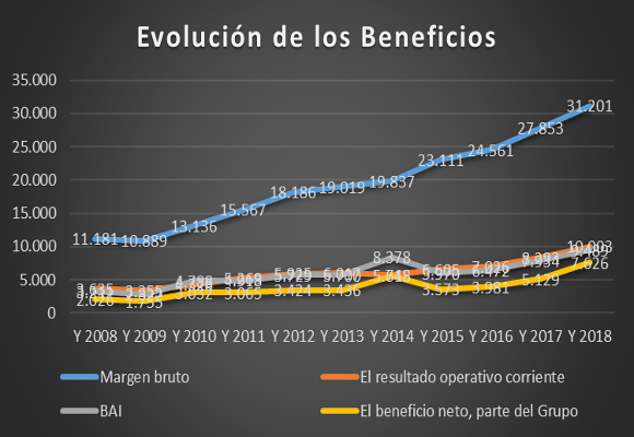 El beneficio neto ha sido de € 7.626 millones, lo que supone una subida respecto al año anterior del 48,68 %. El margen neto se sitúa en el 16,29 %, el más alto desde 2008 y suponen un incremento de 426 p.b. respecto al año anterior.