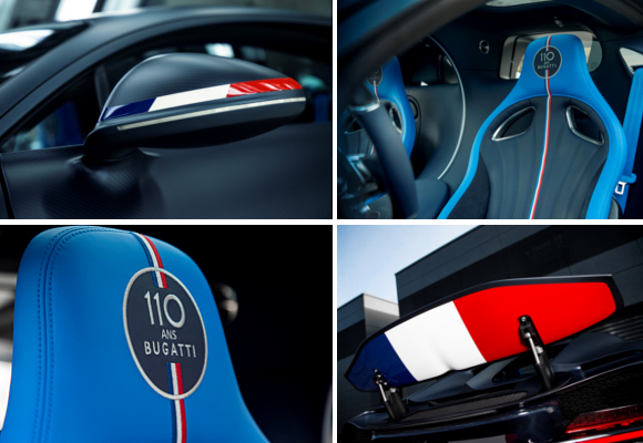 Especialista en lanzar ediciones limitadas de sus modelo y para rendir tributo al aniversario de la fundación de la compañía por Ettore Bugatti en 1909 y también a Francia, el Bugatti 110 Ans, presenta una decoración inspirada en los colores de la bandera gala. Estos exclusivos detalles, podemos encontrarlos en la parte inferior del alerón trasero, en los asientos, así como en los retrovisores, además de lucir una exclusiva carrocería de fibra de carbono tintada en color azul.