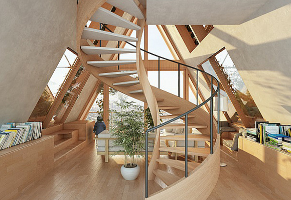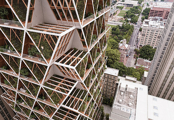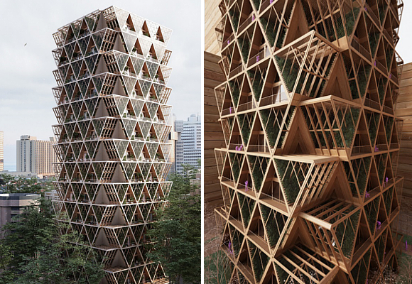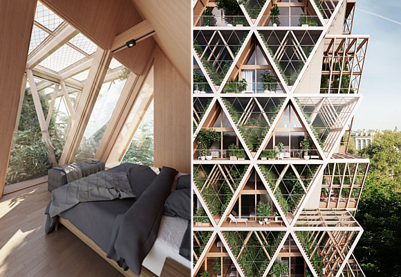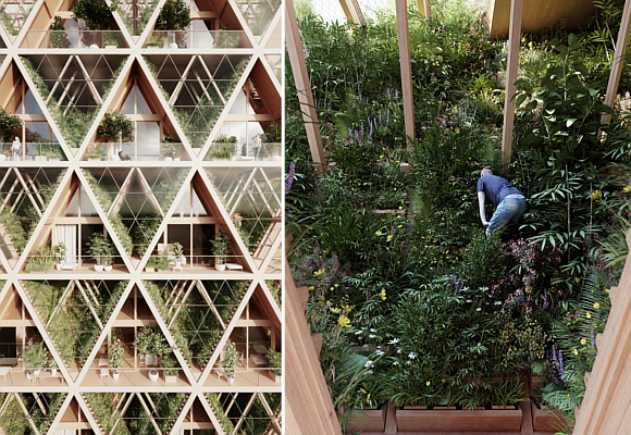 El sistema constructivo propuesto por los técnicos se basa en un producto del que ya hemos hablado en varias ocasiones en la revista: la madera laminada o CLT. En otras palabras, madera tratada para ser más eficiente y durar más. Con este material se crean los módulos estructurales en forma triangular, así como los acabados y los maceteros. Es una materia prima fácil de fabricar, ligera, fácil de transportar y de instalación sencilla y rápida. Además, vivir en edificios de madera conlleva beneficios ecológicos, dado que su producción genera menos gases de efecto invernadero.