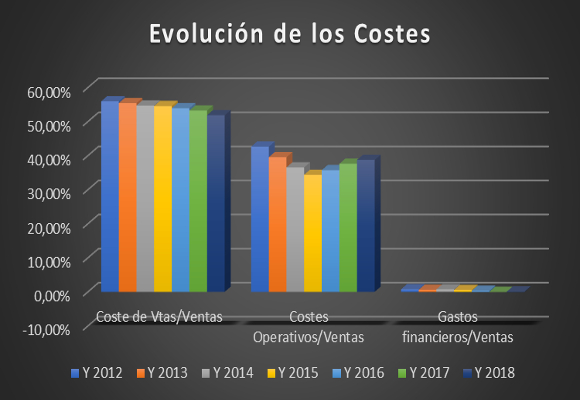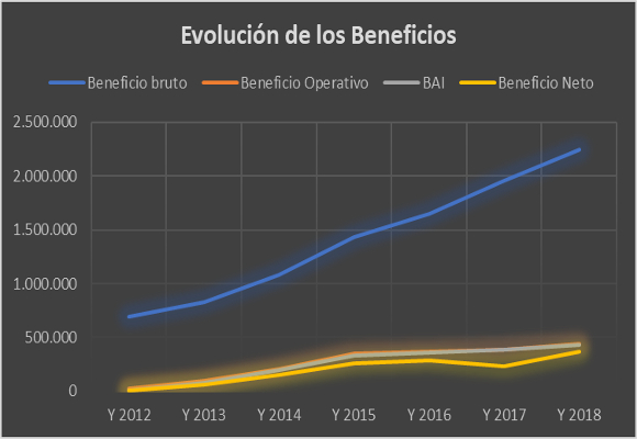 Como podemos observar en el gráfico, en valor absoluto, es el mayor nivel de ingresos de los últimos años. Y lo que es más importante, la ruptura de la tendencia bajista en la variación de las ventas netas, ya que veníamos de niveles del 34,12 % de crecimiento interanual del año 2015. Si bien el crecimiento de este año es el segundo más bajo de los últimos cinco años.