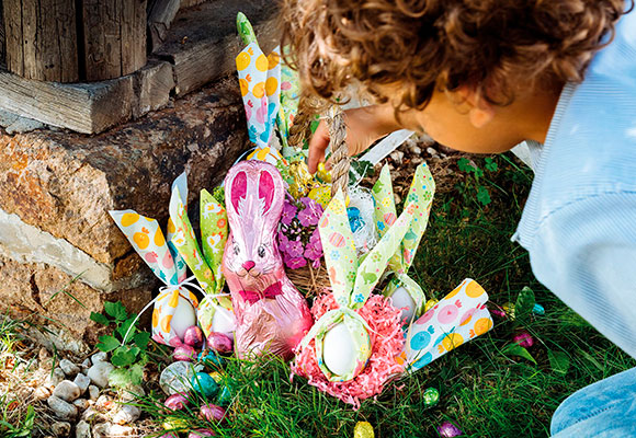 Si queremos que nuestros hijos crean en esta leyenda y participen de ella, una buena opción son los conejos y los huevos de chocolate. Para hacerlos más vistosos y espectaculares podemos colocarles papeles de colores y brillantes a su alrededor, de esta manera, podremos utilizarlos como elemento decorativo y los niños quedarán asombrados con el conejito de Pascua. Estos de Paper + Design dejarán a tus hijos con la boca abierta.