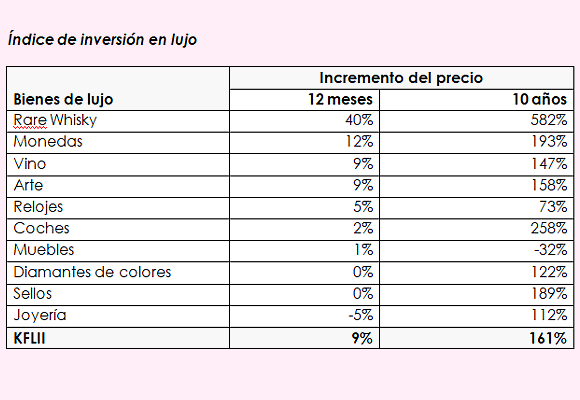 Es la primera vez que esta bebida alcohólica se incluye en dicho informe, en el que se constata que, siguiendo el índice Knight Frank Rare Whisky 100– que refleja la evolución de los precios de 100 de las botellas más deseadas de whisky escocés en subastas en Reino Unido-, en los últimos diez años el whisky ha llegado a aumentar su valor en un 582 %. Un incremento de valor debido, sobre todo, a la buena acogida de este tipo de inversiones en el mercado asiático, donde países como India, China y Singapur concentran casi el 30 % de las exportaciones totales de single malta del primer semestre de 2018, como reflejan los datos de la Asociación de Whisky Escocés.