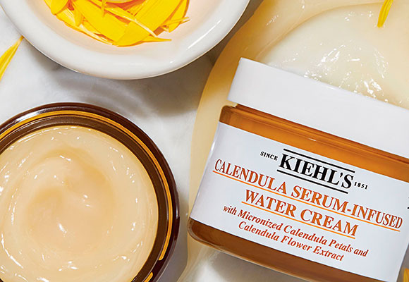 Debido a estas propiedades, la caléndula ha sido tradicionalmente utilizada en cosméticos de lujo y calidad, que saben aprovechar todos sus efectos positivos para la salud. En los años 60, la marca de belleza Kiehl’s lanzó el Calendula Herbal Extract Toner, uno de los tónicos más vendidos en todo el mundo en la actualidad. Gracias a los magníficos resultados de este tónico, Kiehl’s ha seguido sacándole partido a esta planta con productos como Calendula Deep Cleansing Foaming Face Wash o el Calendula & Aloe Soothing Hydrating Mask. Ahora Kiehl’s incorpora un nuevo producto a la gama, el Calendula Serum-Infused Water Cream.