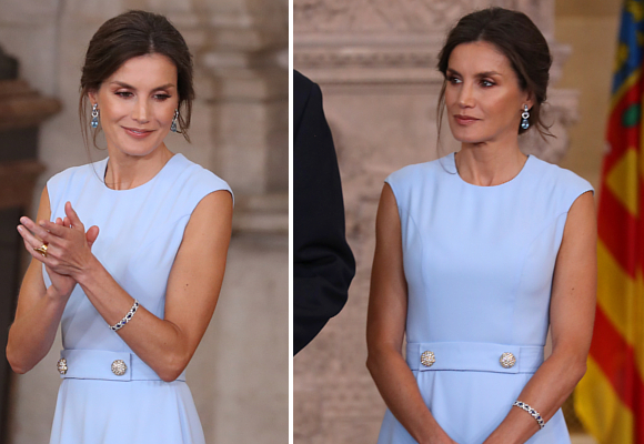Con motivo del quinto aniversario de su reinado, Letizia apareció a mitad de semana muy elegante con su sencillo vestido azul cielo con el único adorno de dos botones joya en la cintura. De este modelo no ha trascendido la autoría.