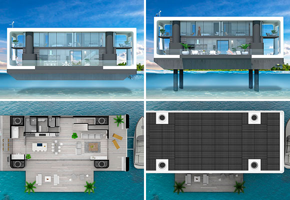 ¿Cómo podemos evitar que el mar engulla nuestras edificaciones y construcciones? Pues lo primero que nos viene a la mente es lo obvio: trasladándolas a un punto más alto. Lo segundo que nos viene a la mente es lo que la empresa Arkup ha tomado como referencia para crear sus edificios… o barcos. La “otra” solución consiste en elevar nuestras construcciones, de forma que no nos afecte la crecida del agua. En la compañía se pusieron manos a la obra y crearon un yate muy especial: ¡Una vivienda que flota y se eleva sobre cuatro pilotes a placer!