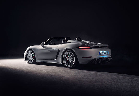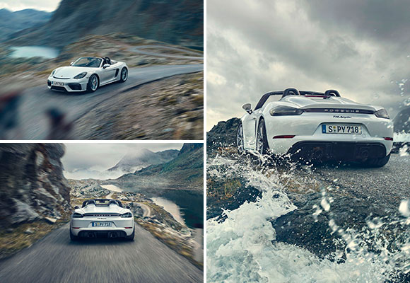 El nuevo 718 Spyder es una máquina pura de proporcionar placer de conducción, con una capota ligera que permite lograr la máxima velocidad. Este modelo continúa la historia de aquellos famosos roadsters como el Porsche 550 Spyder y el 718 RS 60 Spyder. Abierto o cerrado, entusiasma con su cautivadora silueta. La capota es perfecta para el uso diario y se puede plegar de forma sencilla bajo la cubierta posterior. A diferencia del GT4, el 718 Spyder tiene un spoiler trasero que se despliega automáticamente a 120 km/h. Gracias al difusor funcional, es el primer modelo de la familia Boxster que genera carga aerodinámica en el eje posterior.