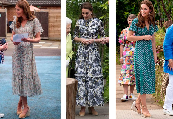 Kate Middleton se decantó por unas alpargatas de Castañer, una empresa española fundada en 1927 con sede en Bañolas, dedicada tradicionalmente a la fabricación de alpargatas de esparto y calzado en general. El modelo preferido por Kate es un par de alpargatas con tacón de cuña en color marrón claro, con suela de yute y finas tiras anudadas al tobillo, que complementa con un vestido midi estampado en tonos verdes y morados.