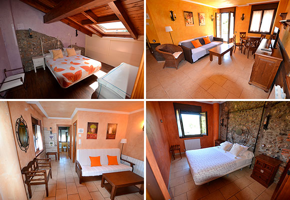 “Tenemos apartamentos de 1 y de 2 dormitorios, distintos en tamaño y capacidades, pero todos con una cuidada decoración rústica. Pueden alojarse desde parejas a familias de hasta 5 miembros, o más, si ocupan más de un apartamento. Tenemos apartamentos familiares en planta baja con grandes terrazas, otros abuhardillados de madera, con mucho encanto”.