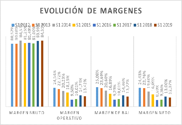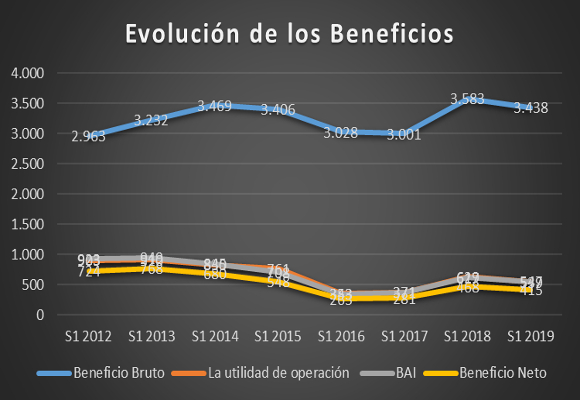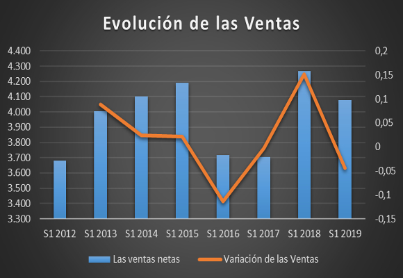 Las ventas netas, durante el primer semestre del año 2019, disminuyeron en un -4,41% respecto al año anterior, situándose en CHF 4.078 millones, frente a los CHF 4.266 millones del mismo periodo del año anterior. Con esta cifra, la compañía, vuelve a tener crecimientos negativos en las ventas, como podemos observar en el siguiente gráfico: