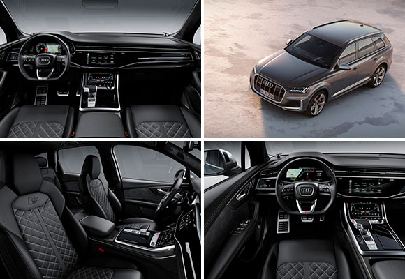 Una combinación de cuero/Alcantara en negro caracteriza el interior del Audi SQ7 que combinan con las inserciones aluminio mate cepillado u, opcionalmente, fibra de carbono, realzando la apariencia deportiva. Además de los asientos deportivos, de serie también se incluyen los umbrales de las puertas delanteras iluminados con el logo S. Los pedales, el reposapié y el protector del umbral de carga del maletero son de acero inoxidable.