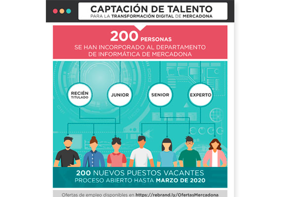 El pasado mes de abril, la compañía iniciaba la búsqueda de nuevos trabajadores, consiguiendo un gran éxito al recibir más de 10.000 solicitudes compatibles con los perfiles requeridos. Este procedimiento de creación de empleo estará abierto hasta marzo de 2020, con el objetivo de poder cubrir los 200 nuevos puestos vacantes que Mercadona necesita para su proyecto de Transformación Digital, al que se han destinado 150 millones de euros. Con esta modernización la empresa busca incorporar distintas soluciones informáticas que faciliten la toma de decisiones e incrementen la eficiencia y agilidad de los procesos con datos únicos y veraces.