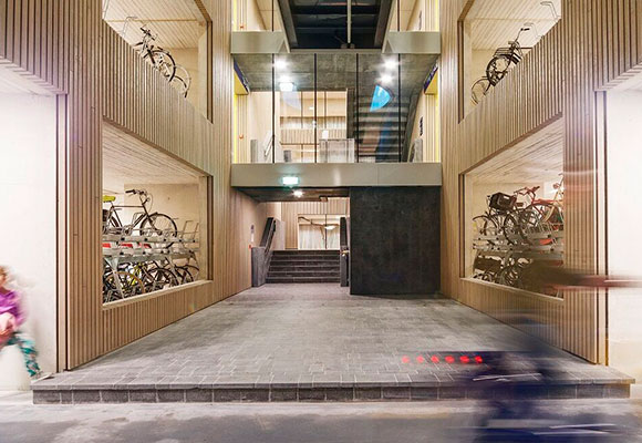 El edificio provee de luz natural las tres plantas mediante patios interiores y abundantes cristaleras al exterior, muchas de ellas directas a la zona de estacionamientos, así, los usuarios podrán ver dónde y cómo está su bicicleta. El color que marca la experiencia interior es el gris cemento, dado que la estructura de hormigón armado es vista, algo ideal, porque se puede ver el estado de conservación de la misma. En total se utilizaron 17.500 metros cúbicos de este maravilloso material, duradero y fiable.