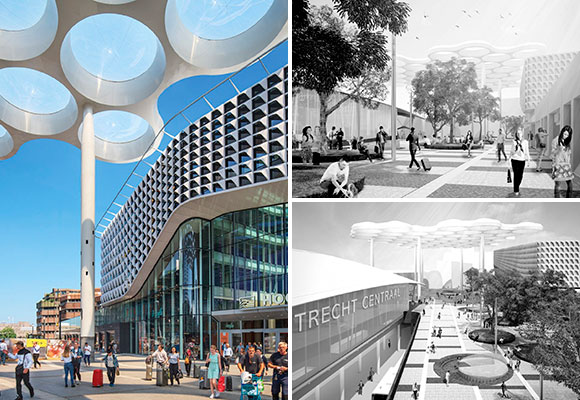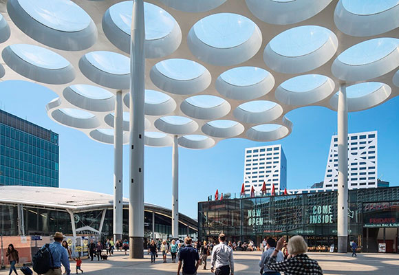 Entre la estación y el parking hay una espectacular pérgola que protege a los viandantes. Unos enormes pedestales soportan una cubierta taladrada con luces led´s (siempre led´s) para orientarnos en la oscuridad y cubrir una hermosa fuente con el símbolo de la ciudad (Utrecht, claro). La pérgola sirve de transición entre los edificios, procesando el escenario perfecto para la fachada de cada uno de ellos. La del parking armoniza con la arquitectura contemporánea, enfatizando la capacidad de asombro del usuario.
