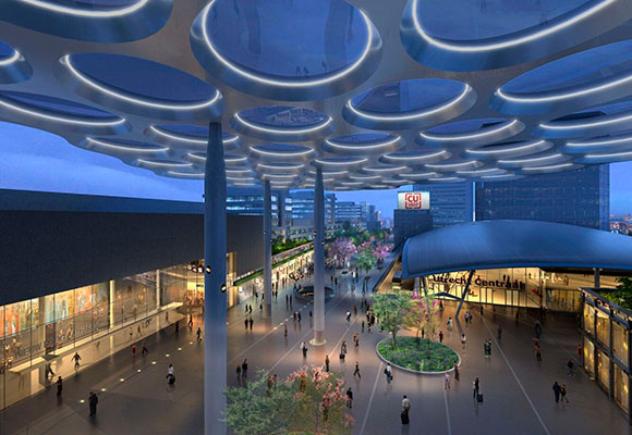 Una bonita y moderna plaza sirve de transición entre la estación de tren y el parking