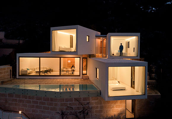 El equipo formado por Paula Caballero y Diego Colón de Carvajal, del estudio Caballero + Colón, obsequiaron a su cliente, Promotoras Europeas S.L., con un edificio realmente espectacular. Can Canyís es una singular vivienda construida en Mallorca, que ha recibido su merecido premio por la categoría Arquitectura Residencial. Su extraordinaria ubicación, con vistas a la Bahía de Canyamel, fue la excusa perfecta para construir cuatro cajas sobre un podio de piedra. Las “cajas” albergan los distintos cuartos de la vivienda, con la pared exterior totalmente translúcida, para sentir más cerca el mediterráneo (por supuesto, tiene piscina).