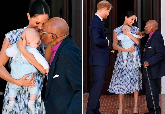 Archie se convirtió en el gran protagonista de la jornada. El pequeño se mostró muy sonriente, despierto y simpático tanto con sus padres como con Desmond Tutu, que le dedicó varias carantoñas. Para la ocasión baby Sussex lució un bonito peto de rayas azul celeste, acompañado de una camiseta blanca y calcetines. Su madre se decantó por un vestido fluido de corte primaveral en blanco y negro de Club Mónaco, que acompaño de unos bonitos salones negros.
