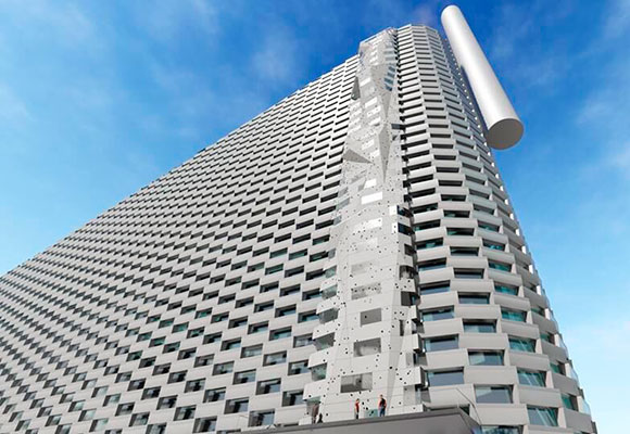 Además de la pista de esquí, el edificio dispone de un rocódromo y un ascensor panorámico con las mejores vistas de la ciudad