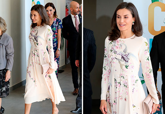Para tan importante cita la reina ha querido lucir un bonito vestido de cuello redondo, con cuerpo entallado y falda midi de evasé, de color rosa empolvado y bordados de estilo oriental con grullas y flores en color verde, rosa, gris y morado. Este bonito diseño está firmado por Asos Design, una conocida marca de moda que vende sus prendas de forma exclusiva a través de Internet, por lo que deducimos que doña Letizia también es una gran aficionada de las compras online.