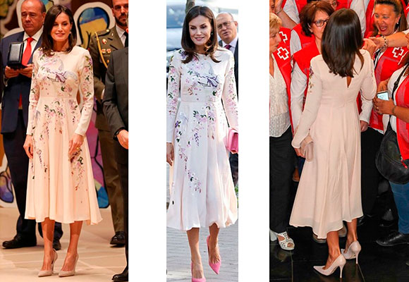 La primera vez que lució el diseño de Asos fue en noviembre de 2018, con motivo de la visita a España del presiente de China Xi Jimping, y su mujer. La reina quiso hacer un guiño al país de sus invitados a través del estilismo y optó por escoger este vestido, debido a su estampado de estética oriental. En esta ocasión lo combinó con unos salones y cartera de mano de color nude de Magrit, una combinación muy acertada que repitió al completo la segunda vez que lo llevó. Sin embargo, cuando el pasado mes de julio volvió a decantarse por el vestido de Asos, apostó por darle más color y un estilo veraniego, al combinarlo con un clutch y stilettos rosa chicle, también de Magrit.