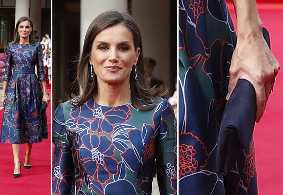 Para la recepción del presidente surcoreano y su esposa, los distinguidos Moon Jae-in y Kim Jung-sook, la Reina ha rescatado del armario otro vestido de Carolina Herrera, que ya lució en Londres el pasado marzo. Un diseño estampado con flores en tonos azules que combinó con unos salones de ante de Nina Ricci y una cartera a juego de Magrit.