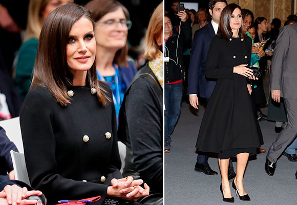 Durante el acto de la COP25, Letizia llevó puesto todo el tiempo el diseño de Carolina Herrera y horas más tarde, en los Premios Internacionales de Periodismo de ABC, Mariano de Cavia, Luca de Tena y Mingote, se desprendía de él para lucir el vestido que llevaba por debajo. Se trataba de un vestido ajustado, con falda de tubo y escote tipo barco, también en color negro.