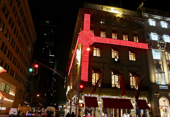 El edificio, situado en el número 653 de la Quinta Avenida, luce por navidades un enorme lazo rojo, un lazo cuyo punto culminante se ubica en la esquina de la cuarta planta, donde convergen dos tiras enormes del mismo color, una en horizontal y otra en vertical, que simulan “empaquetar” el edificio entero. Para los románticos debe ser el mayor regalo que se le puede hacer a una ciudad, además de ser una imagen difícilmente mejorable en las fechas que nos rodean (salvando las que nos hacemos con familiares y amigos, claro).