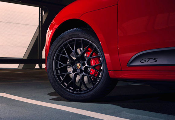 Las llantas RS Spyder Design de 20 pulgadas vienen montadas de serie, junto con los grandes discos de freno de fundición de hierro (360 x 36 milímetros delante y 330 x 22 milímetros detrás). Ambos elementos proporcionan un tacto y una agilidad de un auténtico deportivo al nuevo Macan GTS. Pero, para mejorar aún más la capacidad de deceleración, se ofrecen como opción los frenos Porsche Surface Coated Brake (PSCB), que cuentan con recubrimiento de carburo de tungsteno, o los Porsche Ceramic Composite Brake (PCCB).