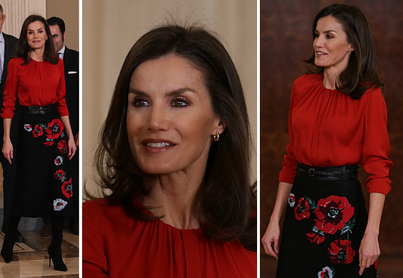 La reina Letizia ha recuperado la blusa roja de Hugo Boss y la falda estampada que ya lució en un acto oficial el pasado noviembre, pero esta vez ha encontrado en los complementos su aliado perfecto. Sobre todo en unas botas altas con tacón que le dan un toque más moderno y vanguardista.