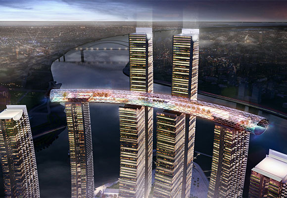 La estructura de acero del puente aéreo pesa 12.000 toneladas, lo mismo que la Torre Eiffel de Francia, y está protegida por un anillo ejecutado con 3.000 placas de vidrio y 5.000 paneles de aluminio. Para la construcción de la estructura, ésta se dividió en nueve segmentos, cuatro ejecutados in situ sobre los rascacielos de apoyo, tres segmentos suspendidos entre las torres, que se elevaron desde el suelo mediante gatos hidráulicos, y dos voladizos a los extremos compuestos por piezas ensambladas desde los edificios. Esto nos lo podría explicar la empresa encargada de las operaciones de izado, Favelle Favco Group.