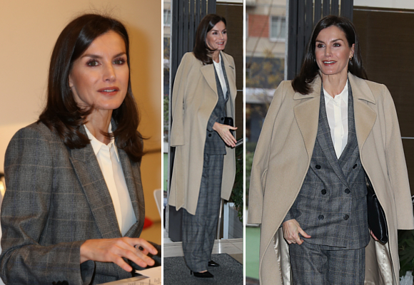 La Reina ha elegido un abrigo de paño en tono beige para resguardarse del frío de la mañana y un traje sastre de cuadros muy masculino. Como complementos, zapatos de tacón en negro y la cartera de trabajo de Hugo Boss que suele utilizar en algunas citas de trabajo.