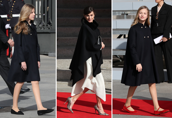 El color rojo, uno de los preferidos de la Reina en diversos actos oficiales, lo ha escogido de nuevo su hija mayor. A la princesa Leonor la hemos visto entrar en el Congreso de los Diputados con un vestido rojo bajo un abrigo capa para resguardarse del tímido frío de la mañana en Madrid. La infanta Sofía ha escogido un vestido blanco con cuadros estampados.