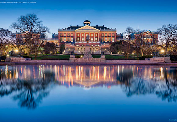 La historia nos cuenta cómo William Thornton, médico, inventor, pintor y, cómo no, arquitecto, se presentó a última hora con un diseño que convenció a la mayoría del Parlamento de la época, encabezado por George Washington. De las manos de Thornton salió una mansión de estilo neoclásico.