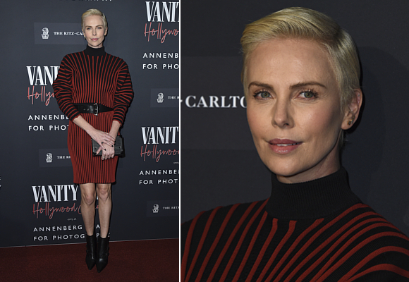 Un evento en el que estuvieron presentes numerosas actrices y algunas de las nominadas este año por la Academia, como Charlize Theron, cuyo nombre aparece en todas las quinielas para hacerse con una estatuilla como mejor actriz por su papel en Bombshell. La actriz escogió para la ocasión un vestido ceñido de punto, con cuello alto y rayas negras y rojas, que combinó con un cinturón de hebilla ancho y unos botines negros.