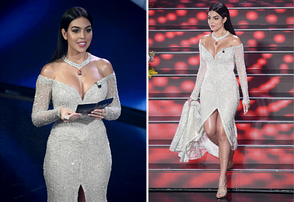 Tanto que a la noche, siendo invitados de excepción en el Festival de San Remo, Georgina Rodríguez acabó eclipsando a los cantantes que hasta el sábado van a luchar por la victoria en este certamen de la canción que patrocina la televisión pública italiana. La modelo ejerció las veces de presentadora del evento y apareció sobre el escenario con varios atuendos.